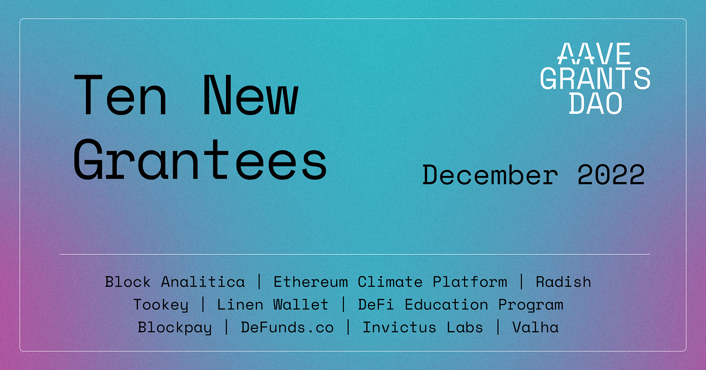 We officially announced ten Aave Grantees from December! Congrats to all the teams: Block Analitica, Ethereum Climate Platform, Radish, Tookey, Linen Wallet, DeFi Education Program, Blockpay, DeFunds.co, Invictus Labs & Valha. Check out each of the teams and give them a ghostly Aave Grants welcome 👻