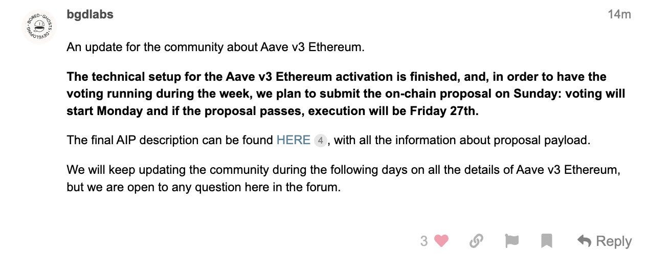 An on-chain vote to launch Aave v3 on Ethereum will go live this upcoming week! If the vote is successful, execution will happen on Friday, January 27th.